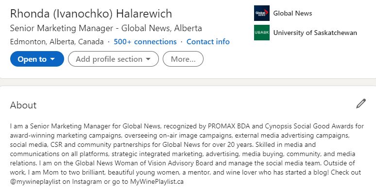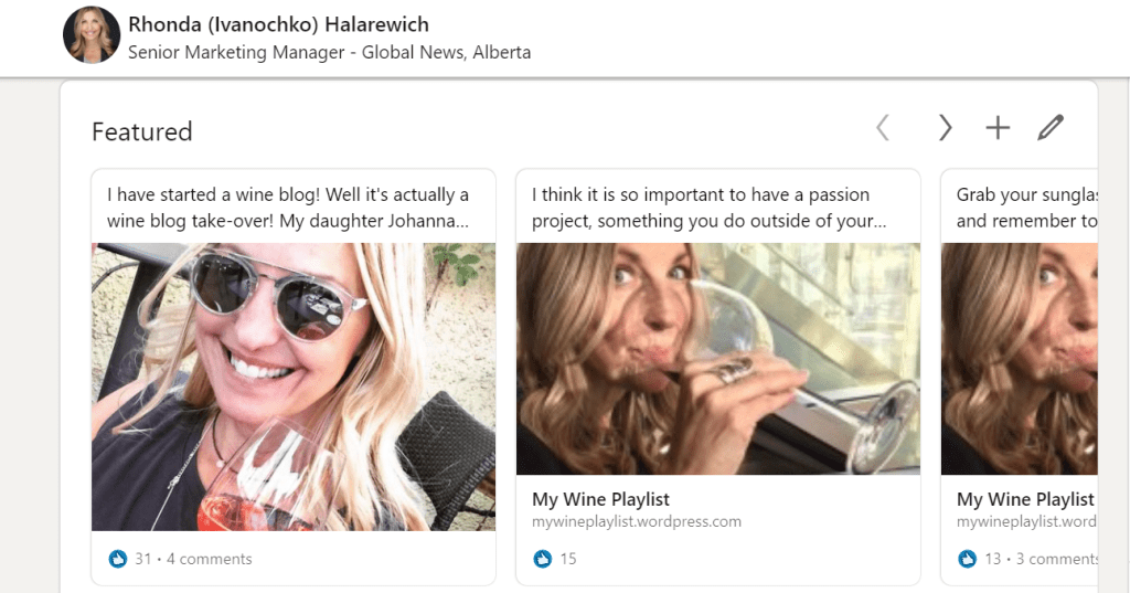 The “Featured” section is a new option on LinkedIn that I haven’t yet explored. Here is an opportunity to showcase your work by highlighting articles you have written and links to relevant media, like photos and presentations, you have shared. I have decided that this is where I will showcase my passion project, My Wine Playlist.