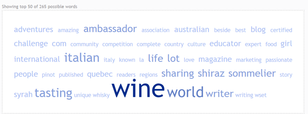 Another tip that Schinkten shares is to identify keywords using tagcrowd.com as a tool to build a word cloud. I did a LinkedIn Search for “wine” and grabbed text from a few wine blogger profiles to see what keywords show up. It’s quite simple, you paste the text and visualize. If I want to show up as a wine blogger, or get my stories in front of people interested in wine, this is what my word cloud would look like.